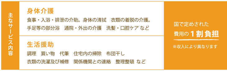訪問介護員(ホームヘルパー・介護福祉士)がご自宅を訪問して、ケアプランに則った必要なサービスを行います。主なサービスは、食事や排せつなどの介助を行う「身体介護」と、調理や掃除などを行う「生活援助」があります。その他、介護保険では行えないサービスは独自のサービスで対応致します。